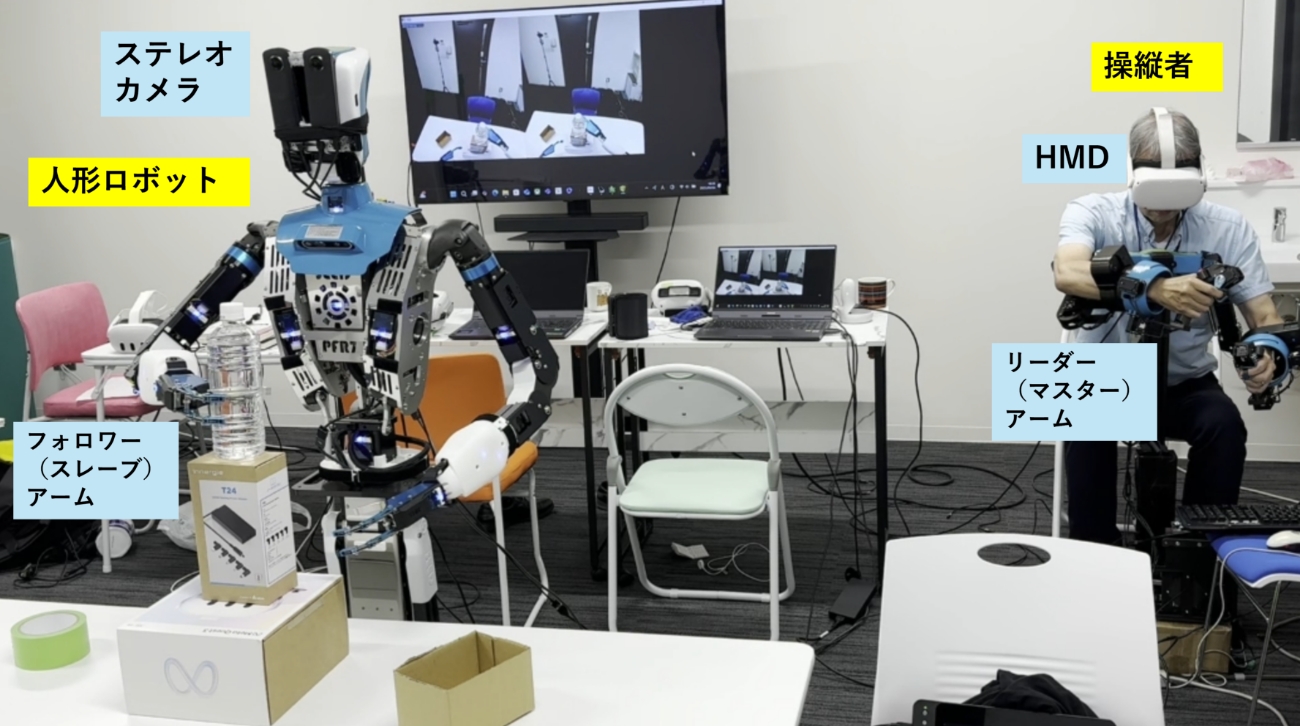 • テレイグジスタンスは、遠隔地の人型ロボットの感覚情報を、操縦者に高い臨場感を持って提示し、ロボットを操縦者の動きに追従するように制御することによって、操縦者がロボットと一体化したような感覚でロボットを操縦できる技術です。