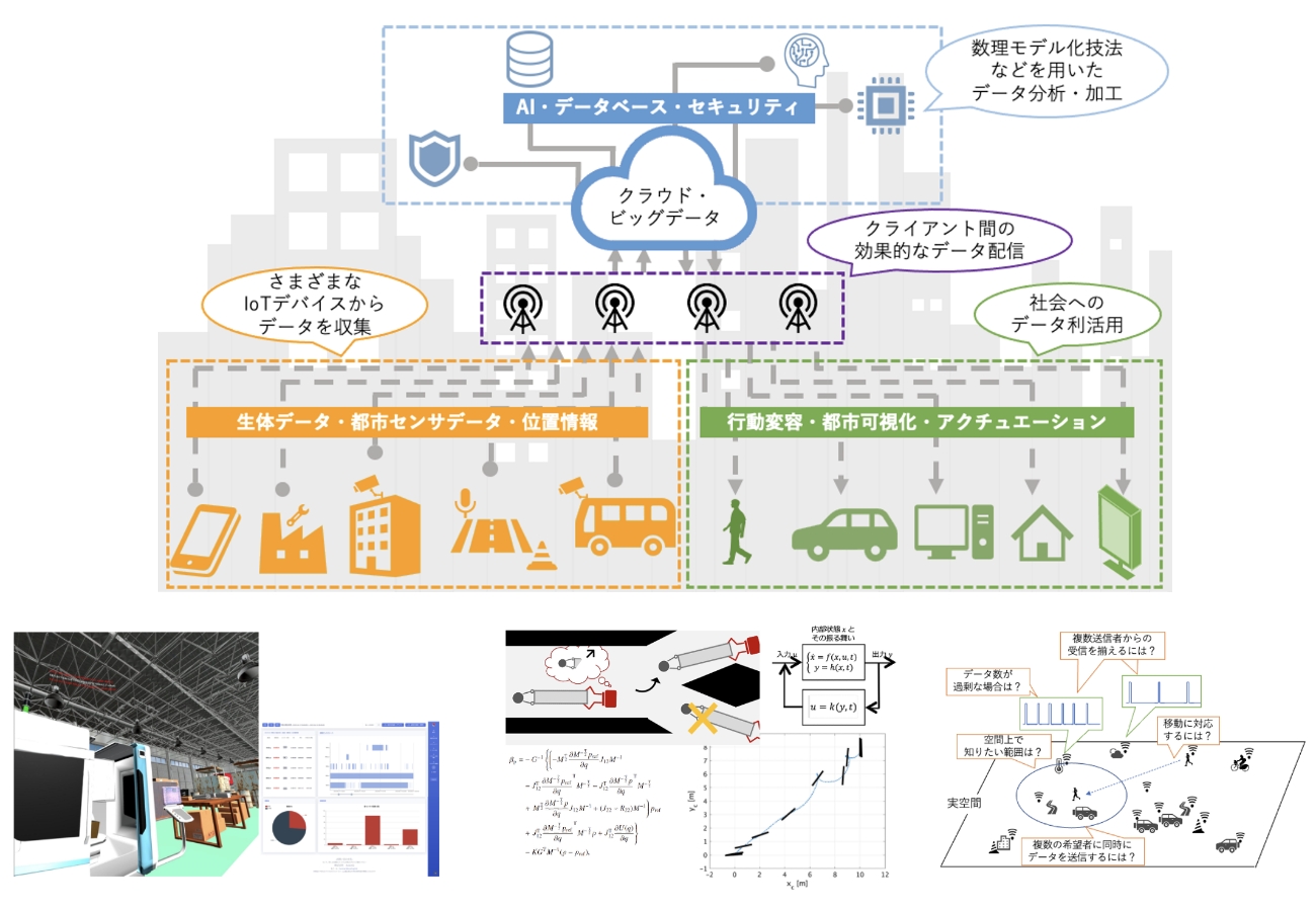 - センサやスマートフォンなどを通して得られた情報を流通させ、AIなどの技術を用いて状況に合わせたサービス提供や人々の行動変容を促し、安心・安全で便利な社会を実現する技術を研究します。